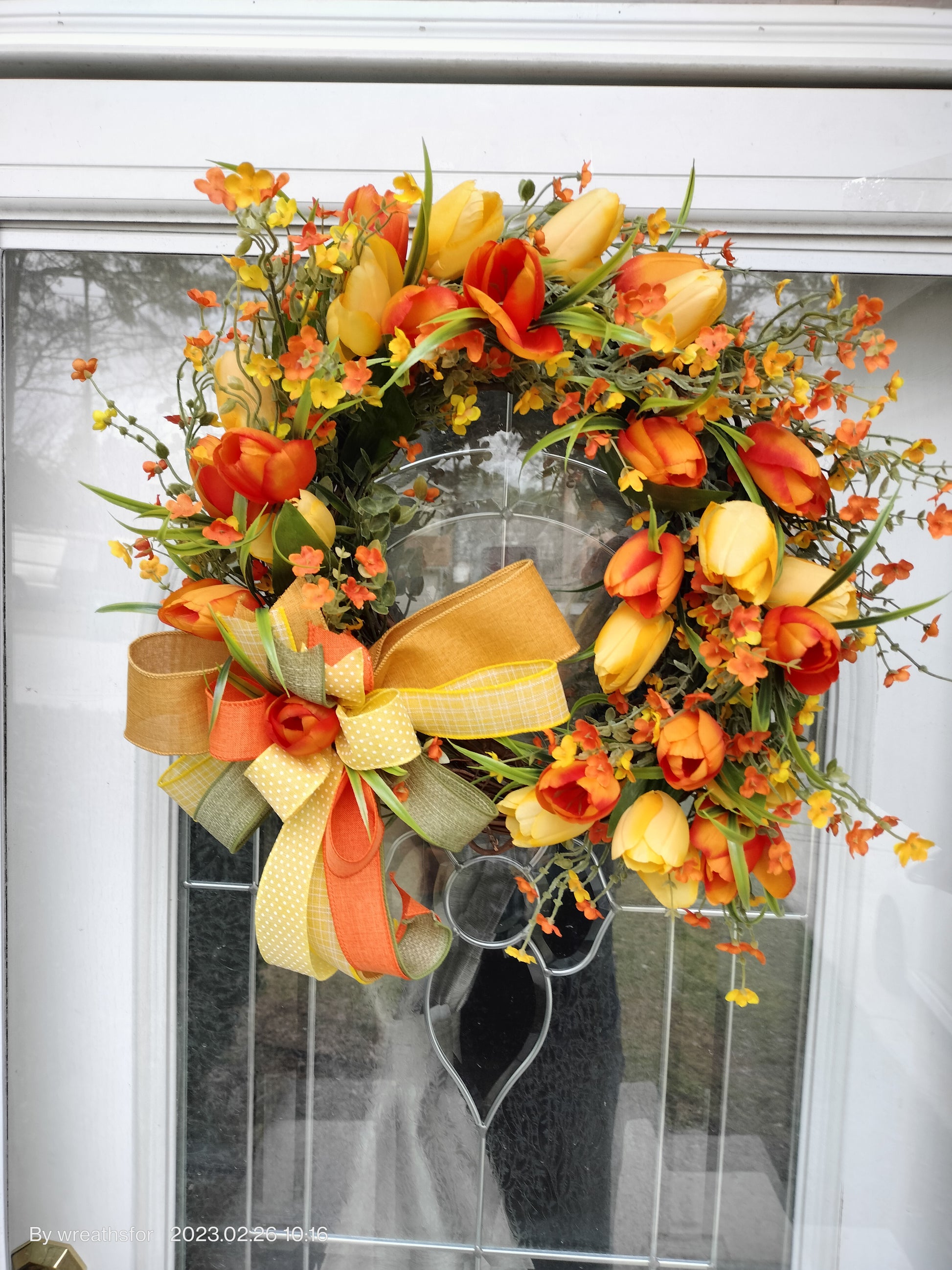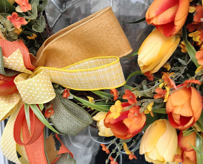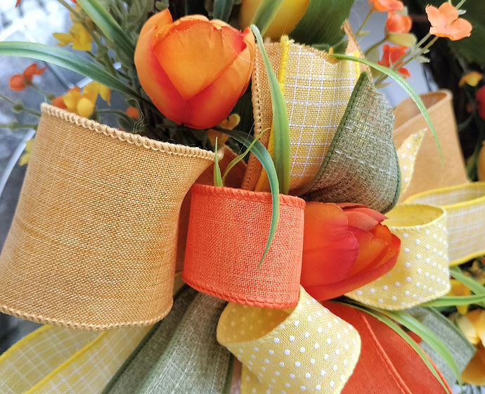 This delightful Spring Wreath featuring vibrant hues of yellow and orange tulips, elegantly arranged amidst lush greenery on a charming grapevine base. This handcrafted wreath captures the essence of spring, bringing a burst of color and natural beauty to any space. Elevate your home decor with this unique and inviting floral arrangement from abUnique Designs."