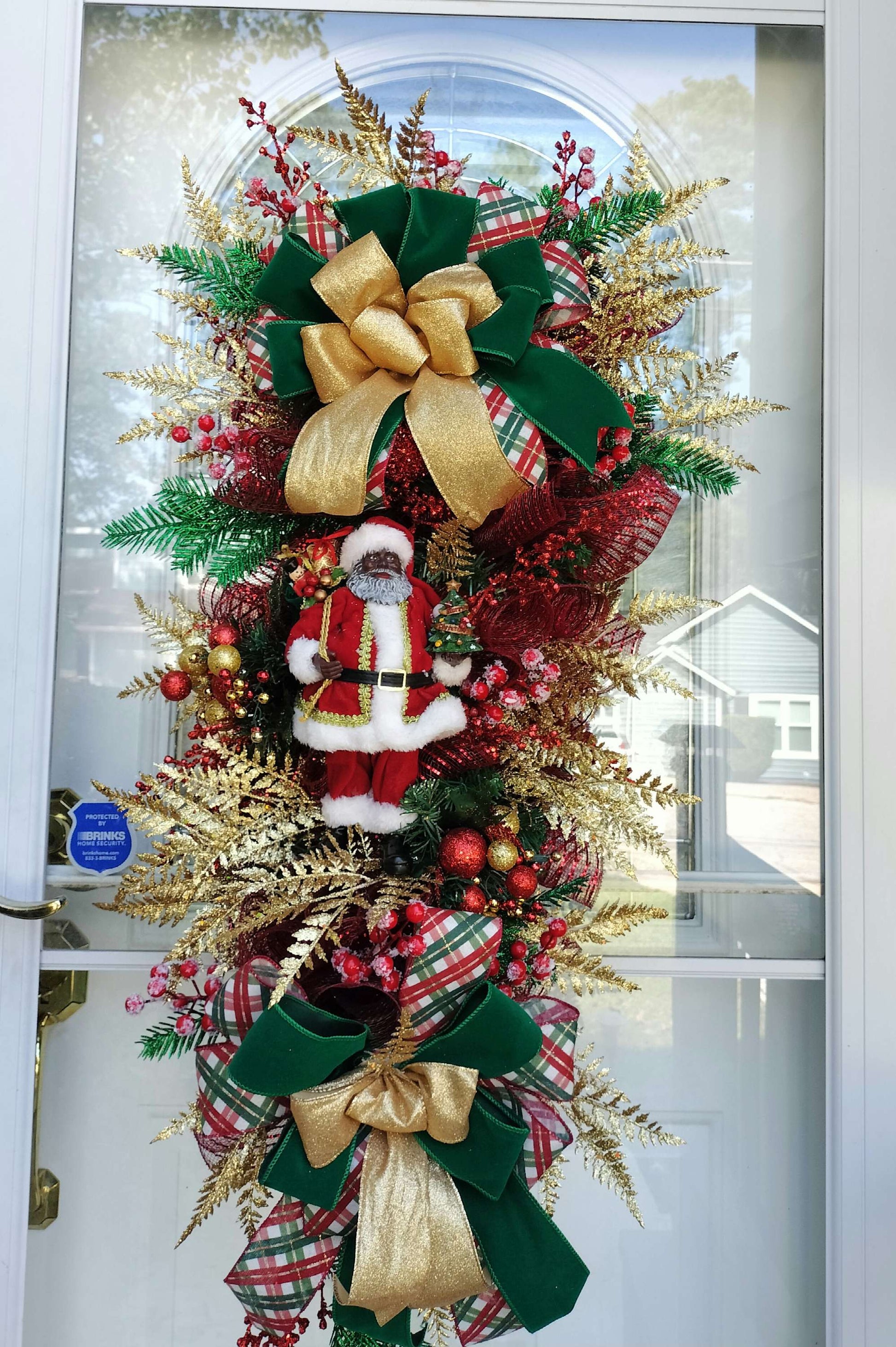 Elevate your holiday décor with this stunning Santa Claus Christmas Door Swag! This handcrafted piece beautifully combines the warmth of the season with a luxurious touch, featuring an elegant arrangement of festive greens, sparkling gold leaves, and vibrant red berries. The centerpiece is a charming Santa Claus, adorned in a plush red suit, holding festive accents like a Christmas tree and nutcracker. Bold, plaid ribbons in classic red, green, and gold, along with shimmering gold bows, give this swag an upscale holiday feel that is perfect for welcoming guests into your home.