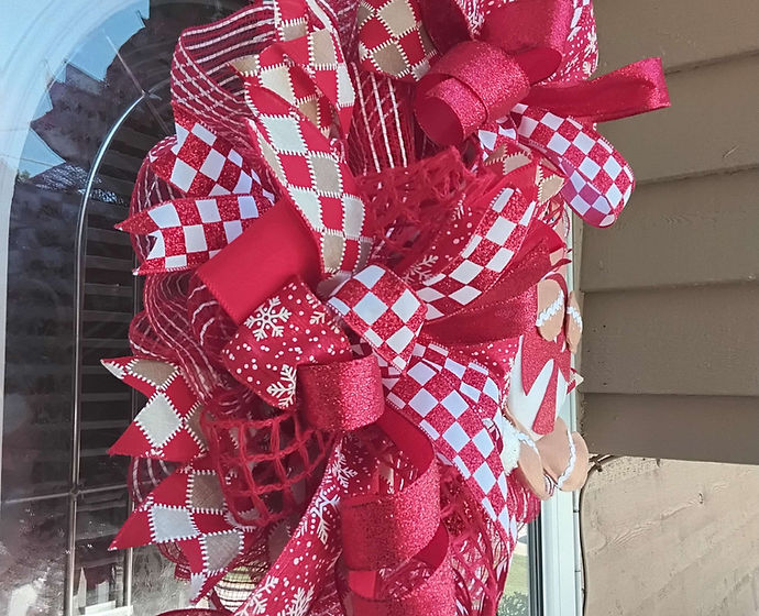 The wreath is adorned with a luxurious mix of red and white checkered ribbon, sparkling red glitter bows, and snowflake-patterned ribbons. The combination of textures and colors creates a visually stunning and festive decoration, perfect for brightening up your front door during the holiday season. This wreath is designed with high-quality materials to ensure durability and long-lasting beauty. It’s a unique piece that will add a touch of holiday cheer to any home.