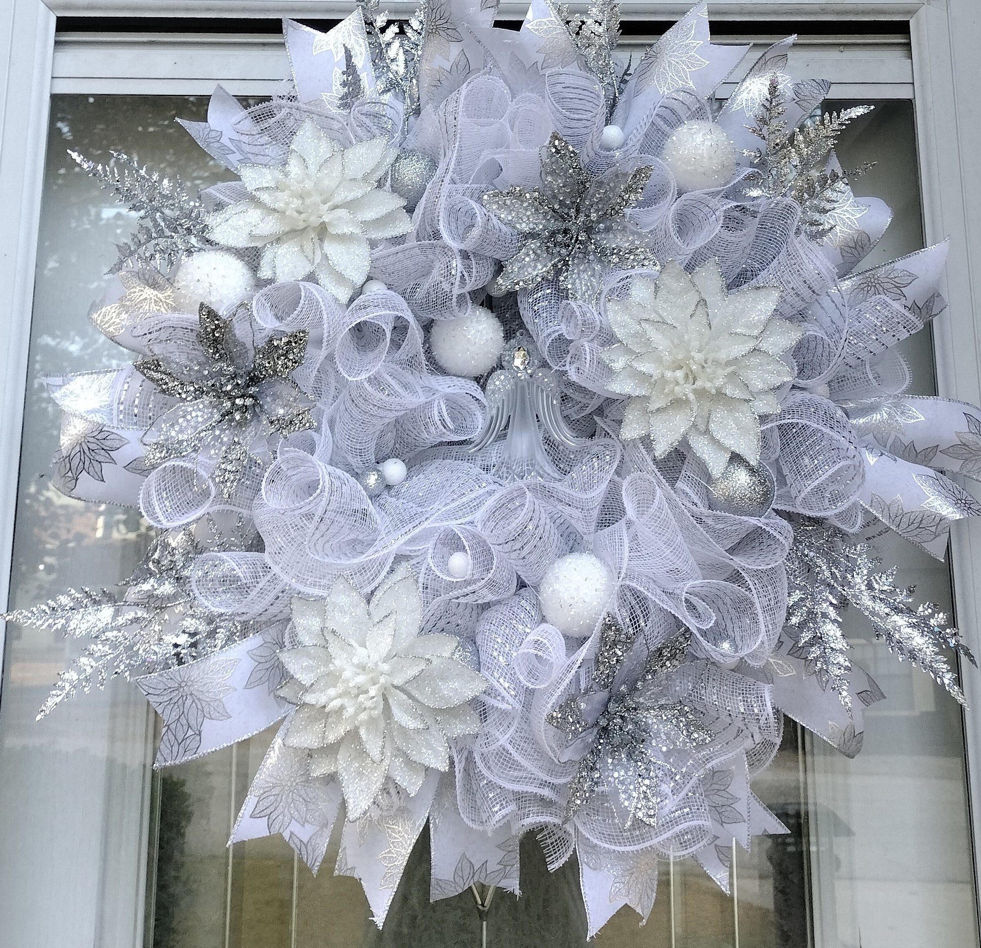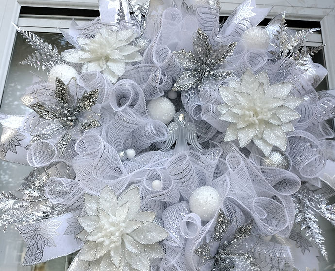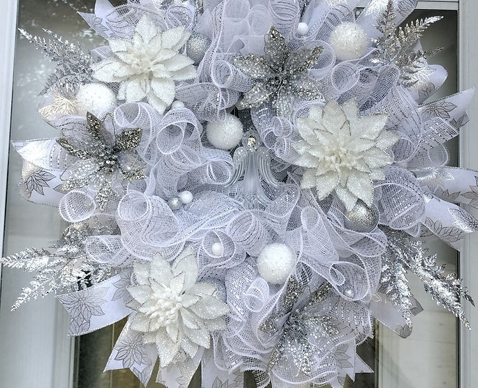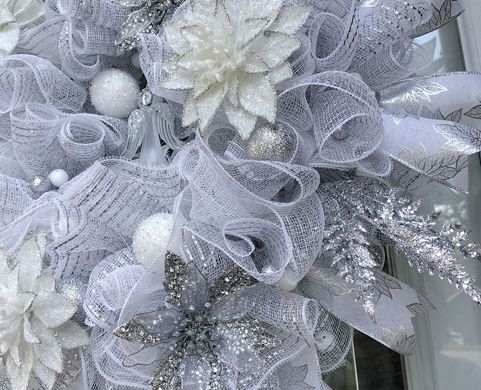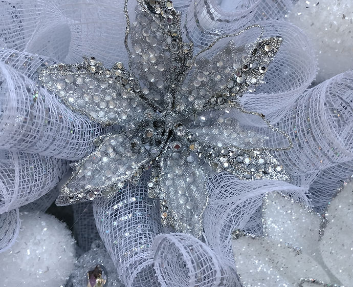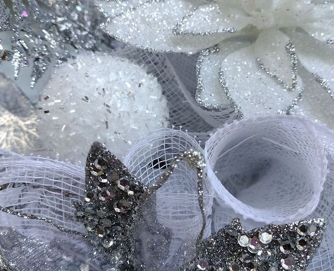 A silver and white wreath with a delicate and elegant design, showcasing a harmonious blend of silver and white elements