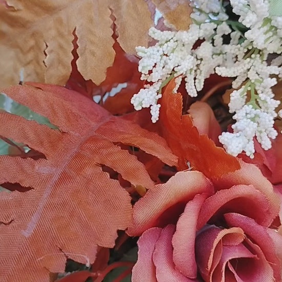 Welcome the season in style with this Grapevine Wreath, thoughtfully handcrafted with the rich tones of fall. Featuring burnt orange and golden ferns, soft green foliage, rustic roses, and delicate white Berry Baie Blanche sprays, this wreath blends warmth and elegance in a timeless design.