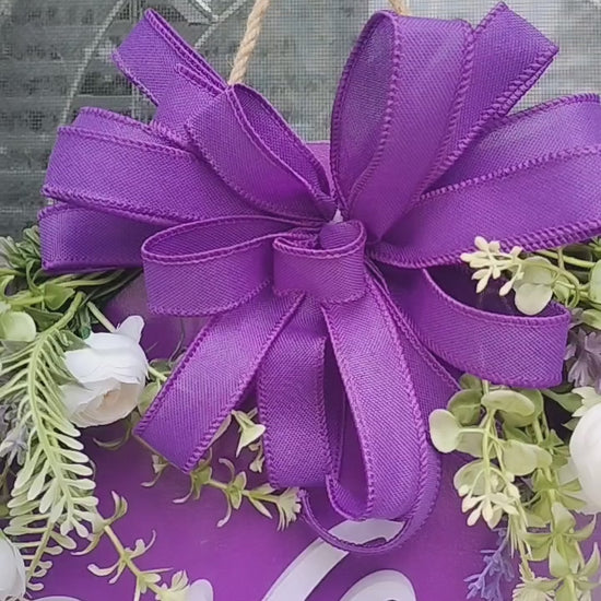Welcome guess in style with this handcrafted purple door hanger, featuring lush florals, layered lavender bows, and a charming "Welcome" sign on a rich wooden round. Accented with butterflies and delicate greenery, it's the perfect elegant touch for your entryway, porch or interior door.